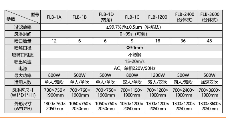 FLB-1D型单人单吹转角风淋室 FLB系列型单人双吹风淋室/彩钢板风淋室/自动风淋室风淋室系列产品是一种通用性较强的局部净化设备,结构新颖、外形美观、运行可靠、低耗节能、维护方便,可广泛应用于电子、机械、医药、食品、彩印包装、酿造、造酒、工程等各种工业及科研领域,通常安装于洁净室与非洁净室之间,用于吹除进入净化厂房的人体和携带物品表面附着的尘埃,同时风淋室也起气闸的作用,防止未经净化的空气进入洁净区域,是进行人身净化和防止室外空气污染洁净区的有效设备。
