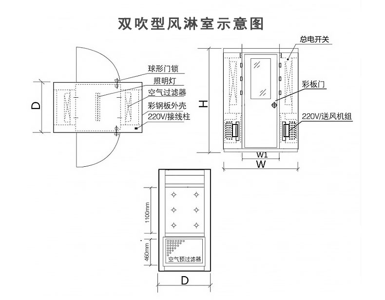 注:喷嘴口单人为6套 双人为9套,可配置成喷淋实行自动控制,通过光电感应实现两门互锁,自动关闭,为人(货)进出提供便利。