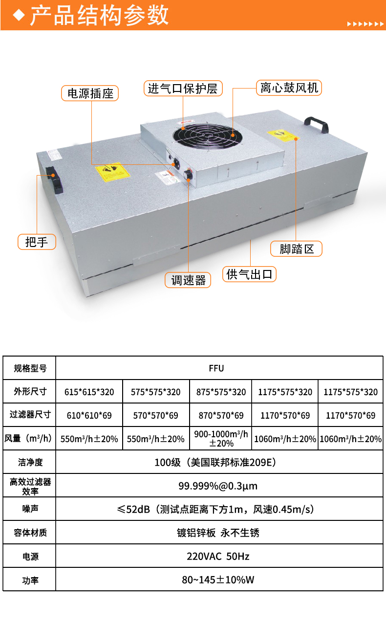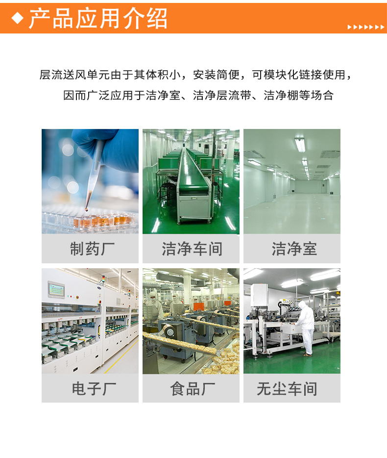 FFU层流送风单元由于其体积小,安装简便,可模块化连接使用,因而被广泛应用于洁净室、洁净层流带、洁净棚等场合。