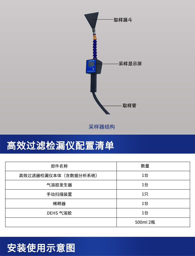 由四个部分组成,以大流量粒子计数器为本体,配合使用手持式扫描采样探头、气溶胶发生器以及稀释器。