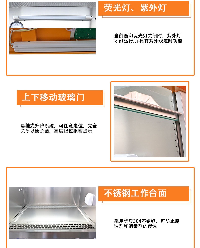 2 、 上下移动玻璃门,可任意定位,易于操作,并能完全关闭以便杀菌,定位高度限位报警提示。