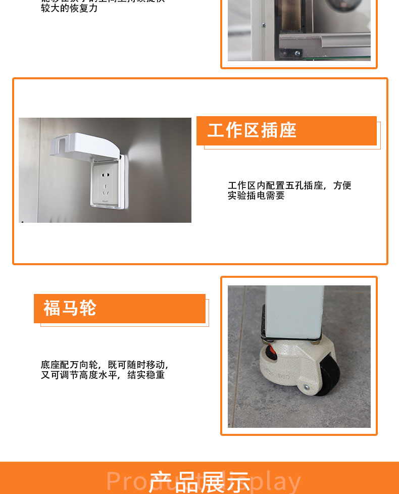 3 、 工作区电源输出插座 , 配备装用防水插座和排污接口为操作者提供极大方便