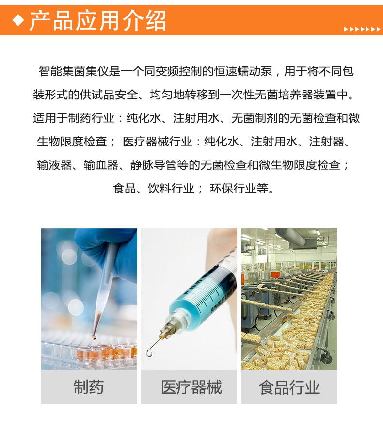 1、 制药行业:纯化水、注射用水、无菌制剂(大输液、小针剂、粉剂、生物制品、血液制品、眼用制剂、保养液等)的无菌检查和微生物限度检查;
