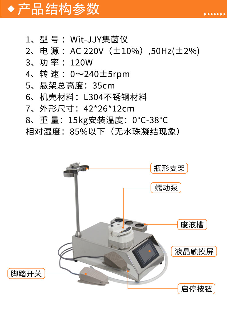 普通集菌仪 Wit-JJY是一次性使用全封闭集菌培养器的配套使用的设施。一体化不锈钢机壳设计:普通集菌仪全部采用L304卫生级不锈钢,解决了无菌室. 微生物室高洁净仪器的要求。