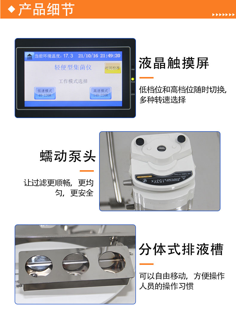 通过集菌仪定向蠕动加压原理,使供试品中微生物截留在滤器中的微孔滤膜(0.22μm*47mm或0.45μm*47mm上,通过冲洗滤膜除去抑菌成分,然后把所需的培养基通过进样管道直接引入全封闭过滤集菌培养器中,放置在培养箱内进行无菌培养。