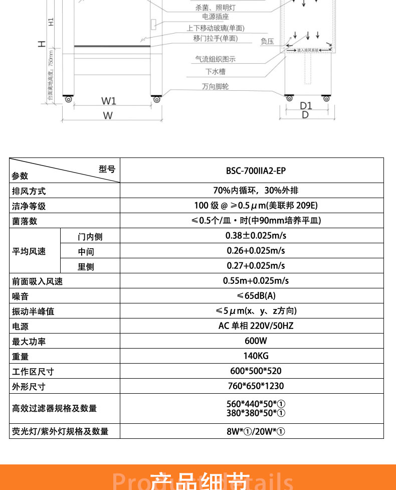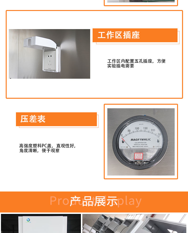 1、气幕式隔离设计,防止内外交叉污染,气流30%外排70%内循环,负压垂层流,无需安装管道。