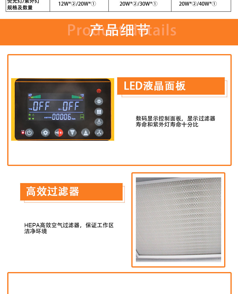 6、采用LED液晶面板控制,内置紫外灯防护装置,当前窗和荧光灯关闭时,紫外灯才能运行,并具有紫外线定时功能
