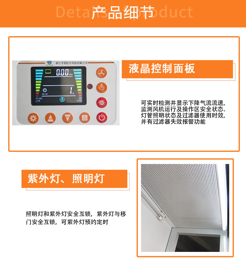5、数显式制界面,更具人性化设计,可实时检测并显示下降气流流速,监测风机运行及操作区安全状态、灯管照明状态及过滤器使用时效,并有过滤器失效报警功能