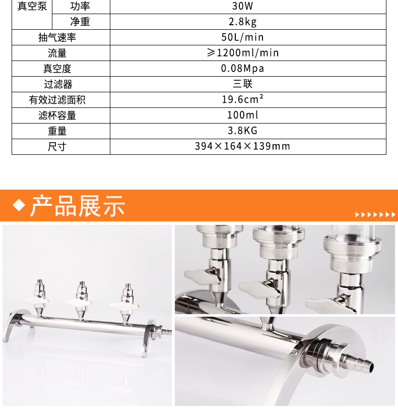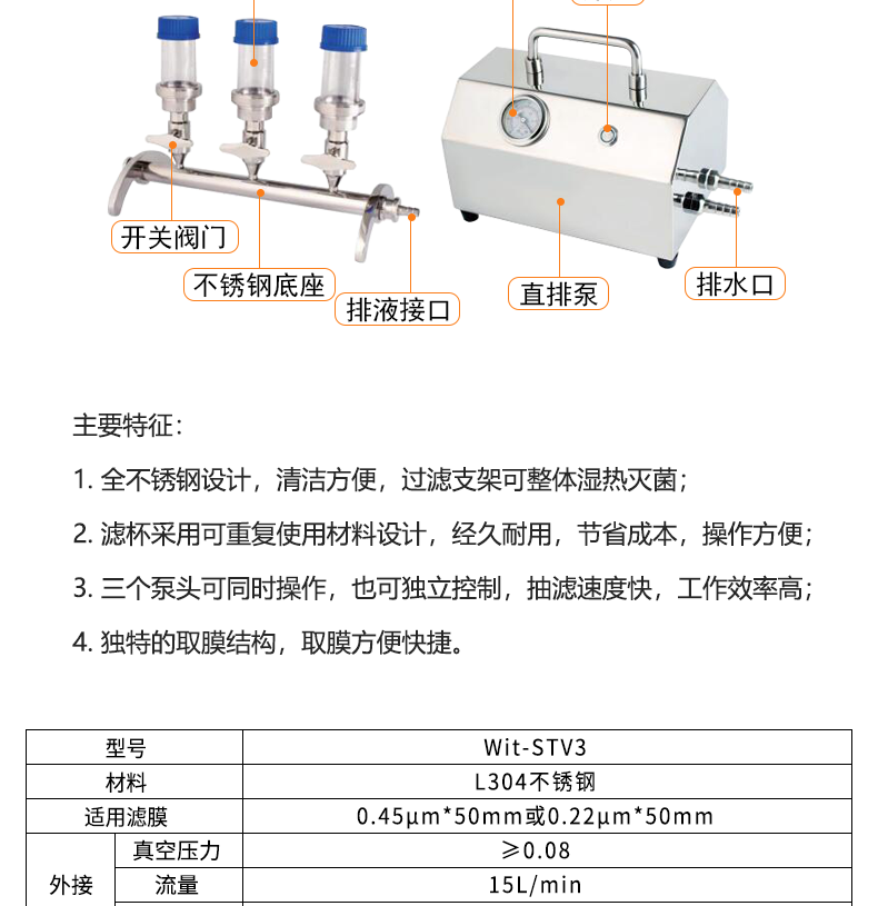 3. 三个泵头可同时操作,也可独立控制,抽滤速度快,工作效率高;