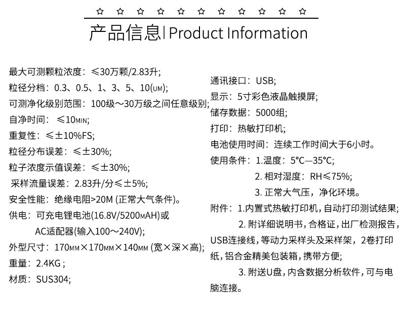 4. 可测净化级别范围:100级~30万级之间任意级别;